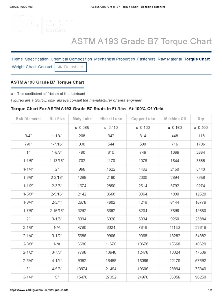 ASTM A193 Grade B7 Torque Chart Boltport Fasteners PDF Screw Nut (Hardware)