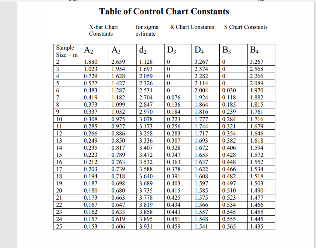 Solved Table of Control Chart Constants Xbar Chart for